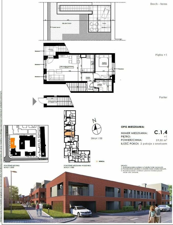 0% prowizji. GOTOWE !!Budynek C lokal: C.1.4, loggia: 3,30 m, taras (na dachu) - 15,5o m