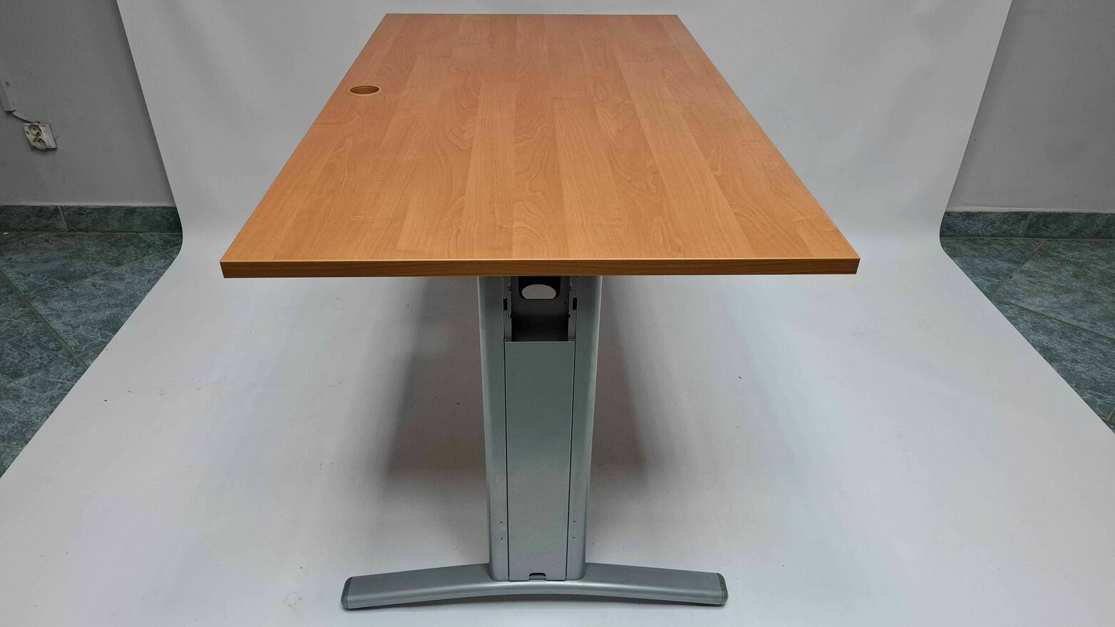 Blat biurka w kolorze olcha z 1 otworem na przewody. Ramę biurka stanowi metalowa łączyna