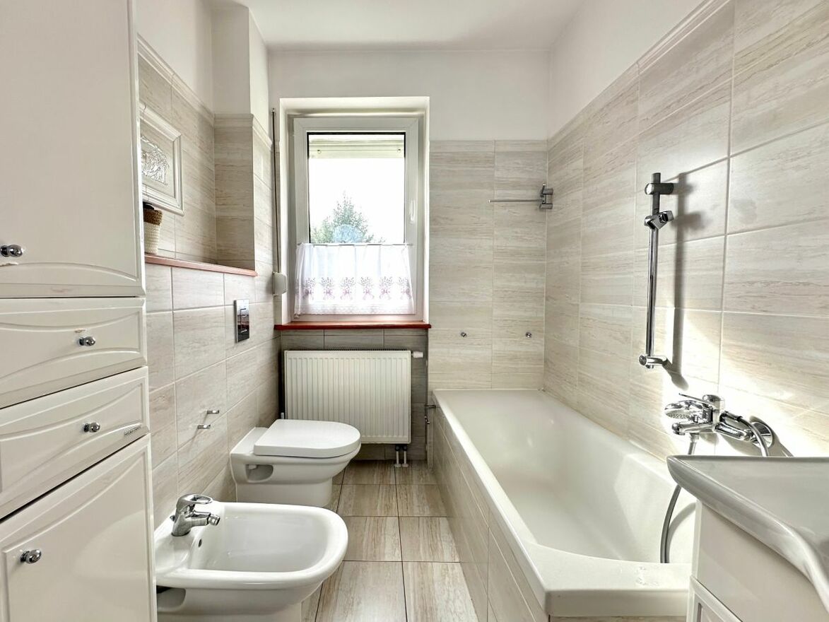 Gabinet z klimatyzacją, kuchnia ze spiżarnią, salon, jadalnia, łazienka z wanną.