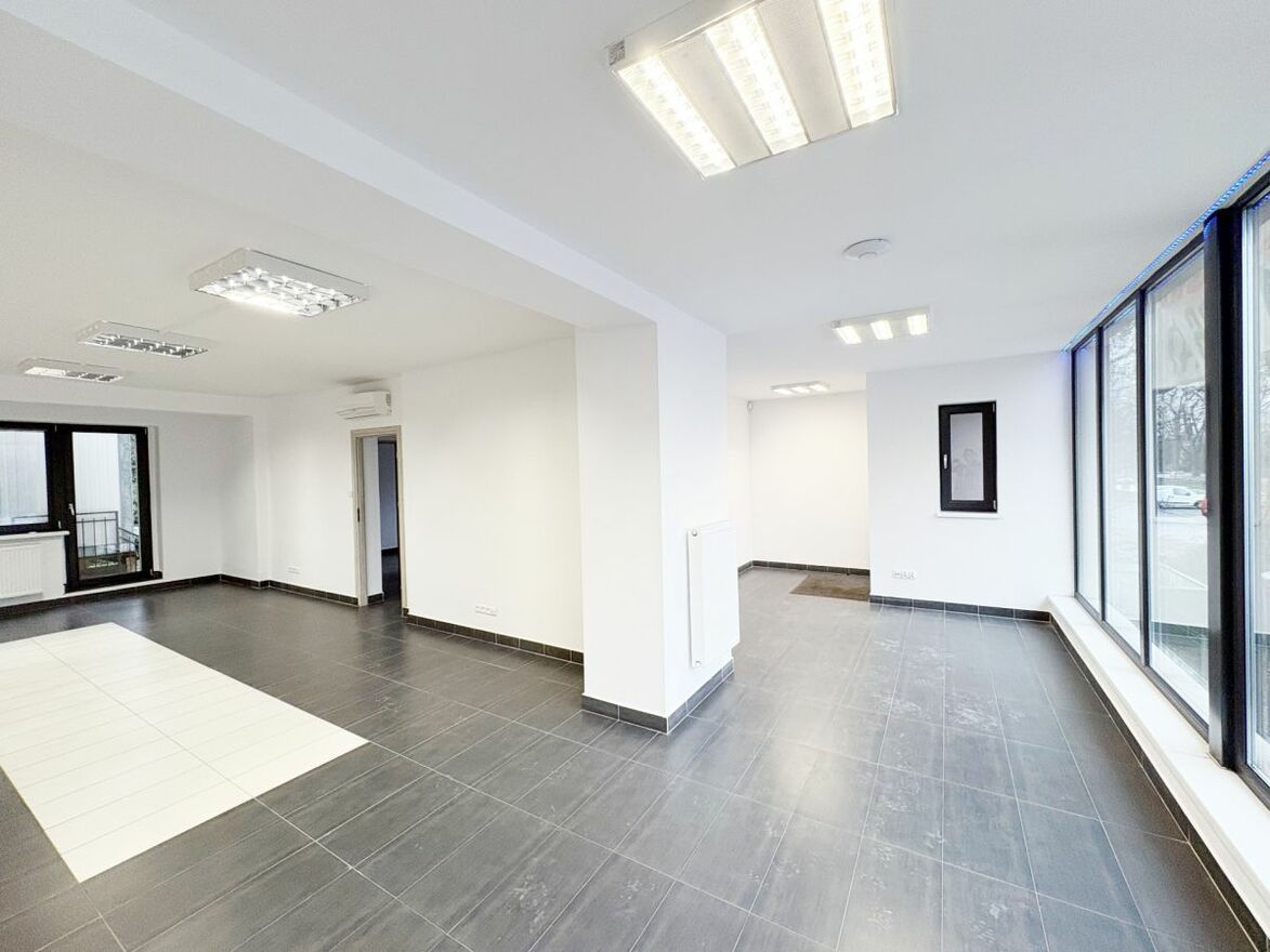 Parter: reprezentacyjna, przeszklona przestrzeń (53 m²) idealna na recepcję, showroom lub open space, kuchnia, WC