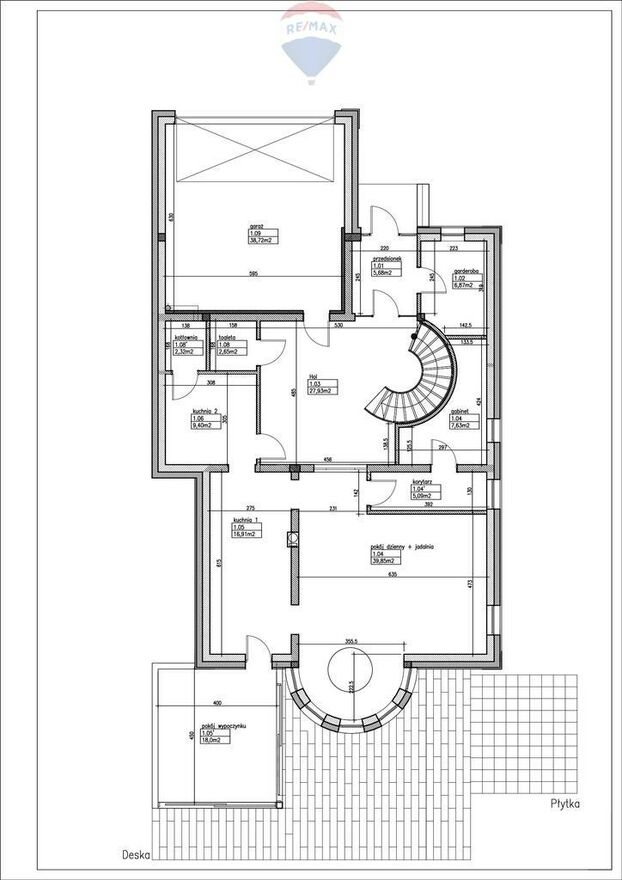 półkolistymi schodami (kamiennymi) na piętro; salon z jadalnią;