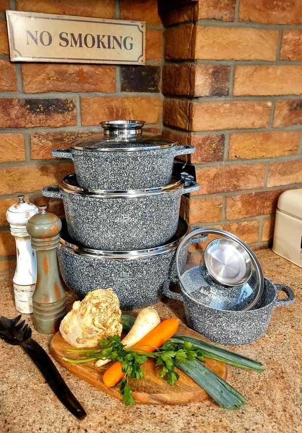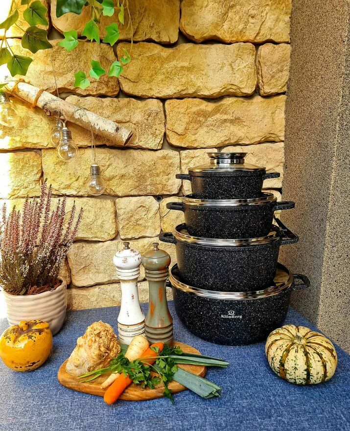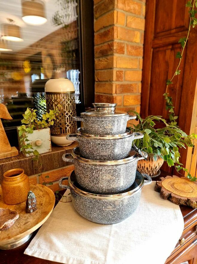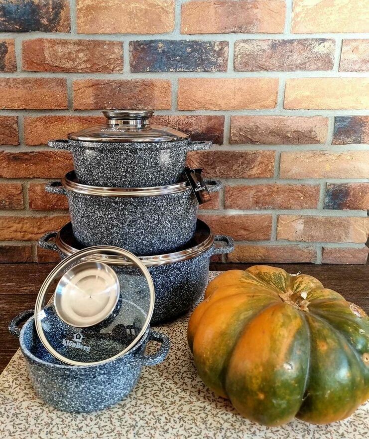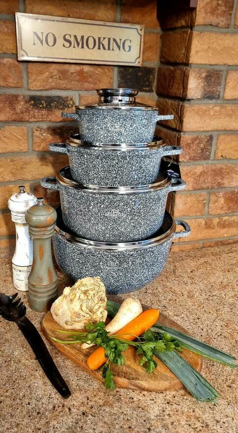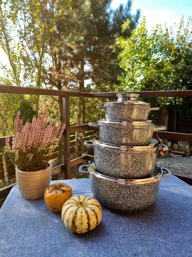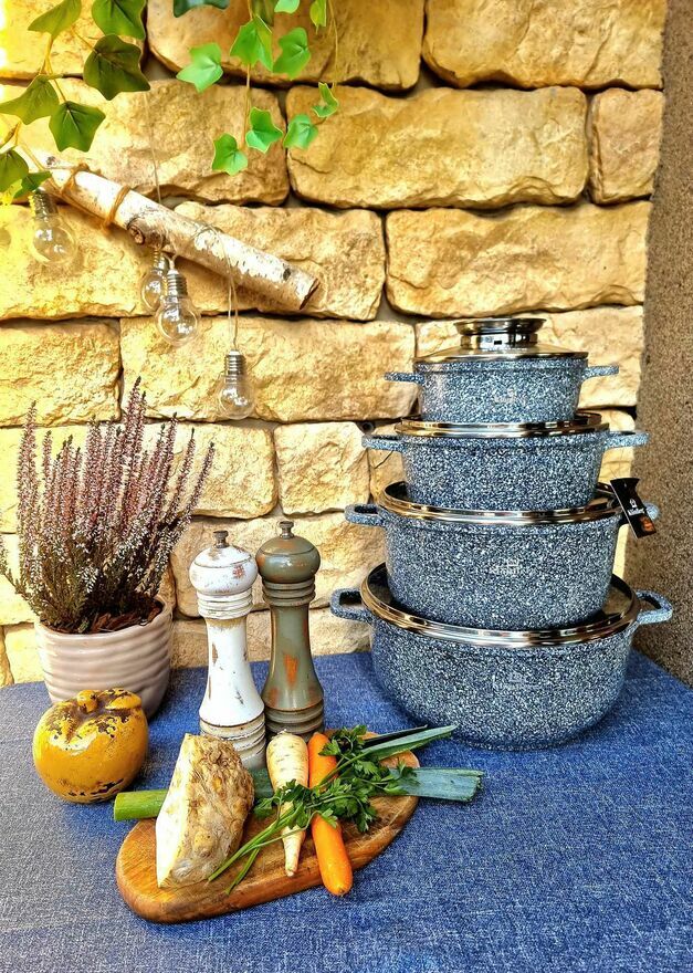 8-częściowy zestaw to luksusowy komplet garnków marmurowych, który powstał w wyniku połączenia wysokiej jakości materiału z nowoczesnym designem i uwzględnieniem funkcjonalności. Umożliwia przyrządzanie pełnowartościowych potraw i doskonale komponuje się z każdym kuchennym wnętrzem – sprawi, że Twoja kuchnia nabierze nowoczesnego stylu i zaskoczy Twoich gości.