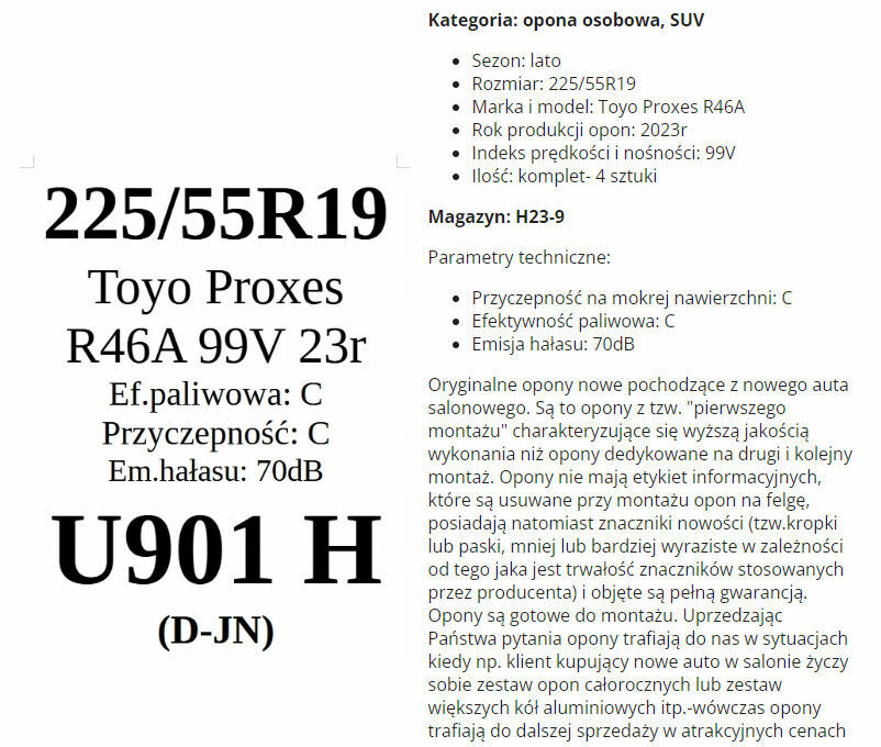 Opony letnie, nowe/nieużywane 225 mm 19 caliNOWE (nieużywane) opony letnie Toyo Proxes R46A 225/55R19 99 V