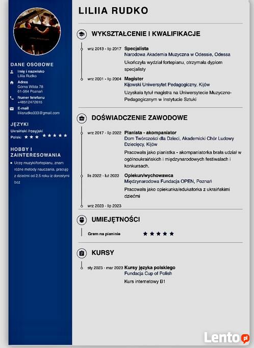 Witam, mam na imię Lilia. Jestem nauczycielem/korepetytorem gry na pianinie.Jestem kreatywną, aktywną, celową, muzykalną, odpowiedzialną dziewczyną,