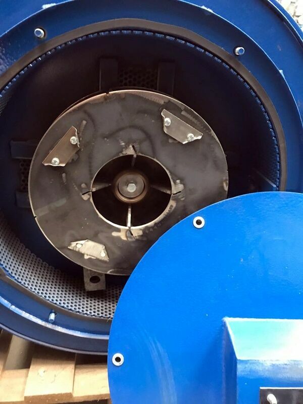 Rozdrobnione surowce są wyrzucane przez sito do obudowy przez kruszarkę młotkową pod wpływem przepływu powietrza wytwarzanego przez wentylator.
