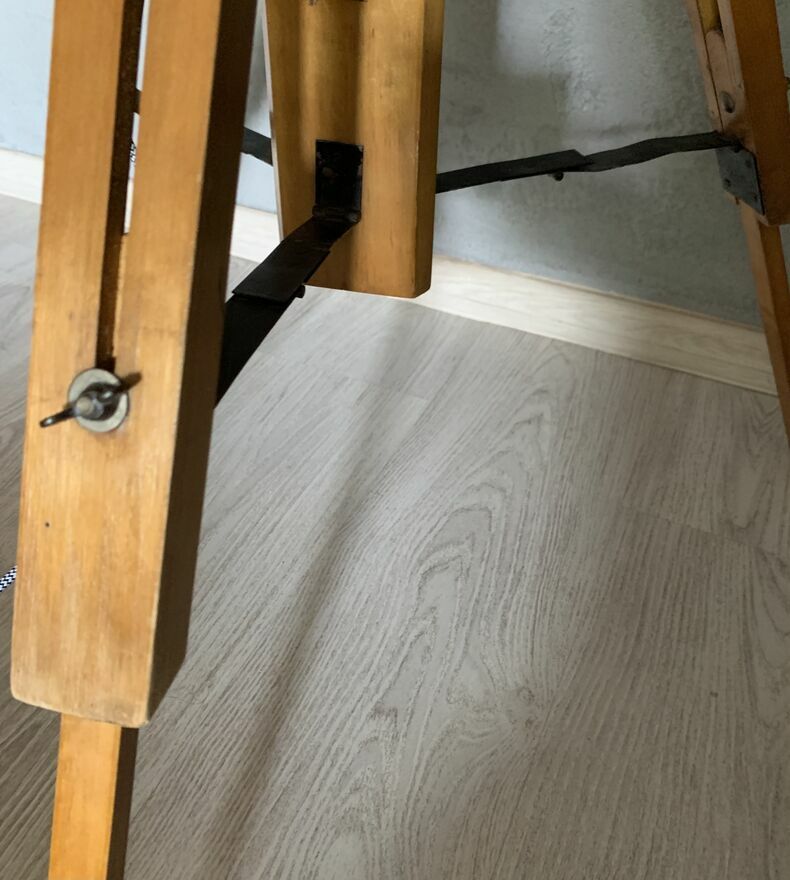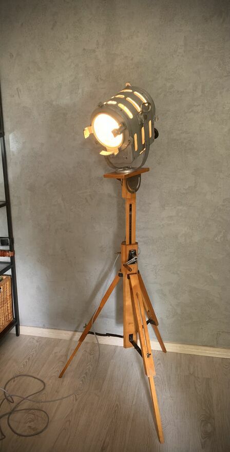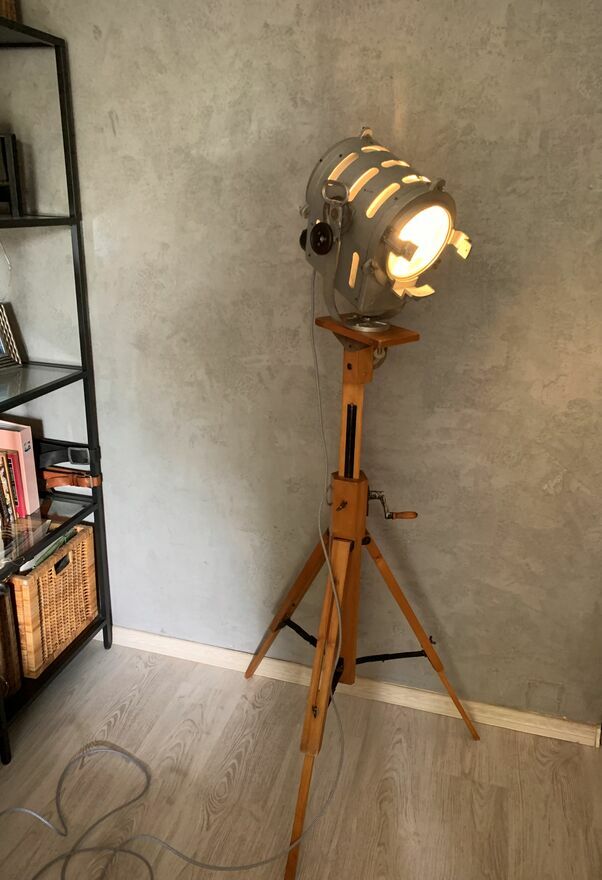 Reflektor osadzony na surowym kolekcjonerskim statywie zabytkowym drewnianym z lat 50-60.