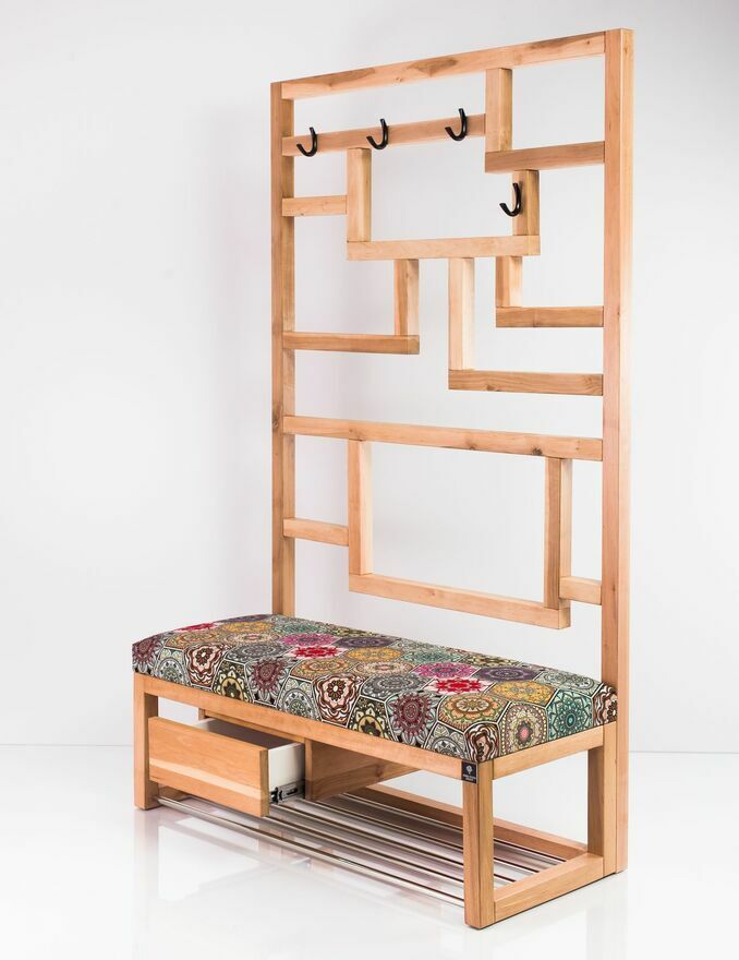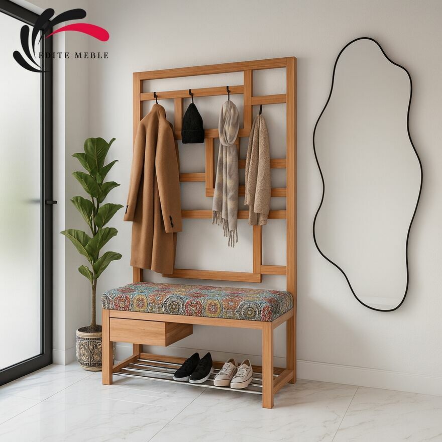 Ławka na buty LGS-18 to harmonijne połączenie estetyki i funkcjonalności stworzone z litego drewna olchowego. Naturalne usłojenie ociepla przestrzeń, a lakierowana powierzchnia odporna na UV i wilgoć zachowuje świetny wygląd na lata. Prosta, elegancka forma z łatwością wpisuje się zarówno w nowoczesne, jak i klasyczne aranżacje. Model wyróżnia stabilna konstrukcja, wygodne siedzisko, wbudowany wieszak na odzież i akcesoria oraz poziom rurek pod siedziskiem, który zapewnia przewiewne przechowywanie obuwia. Praktyczna szufladka mieści drobne przedmioty (klucze, rękawiczki), pomagając utrzymać porządek w strefie wejścia. LGS-18 łączy wytrzymałość, komfort i ponadczasowy design – to funkcjonalny mebel premium, który pięknie organizuje Twój przedpokój.Wymiary: