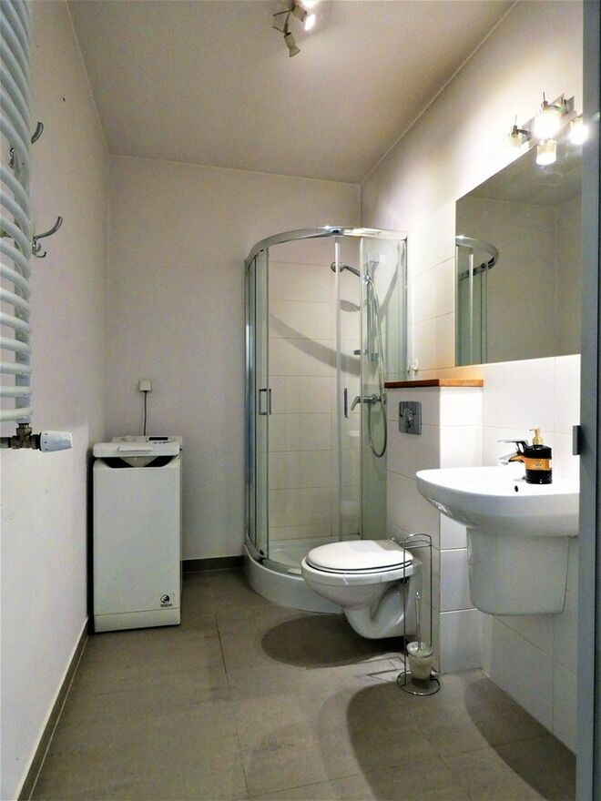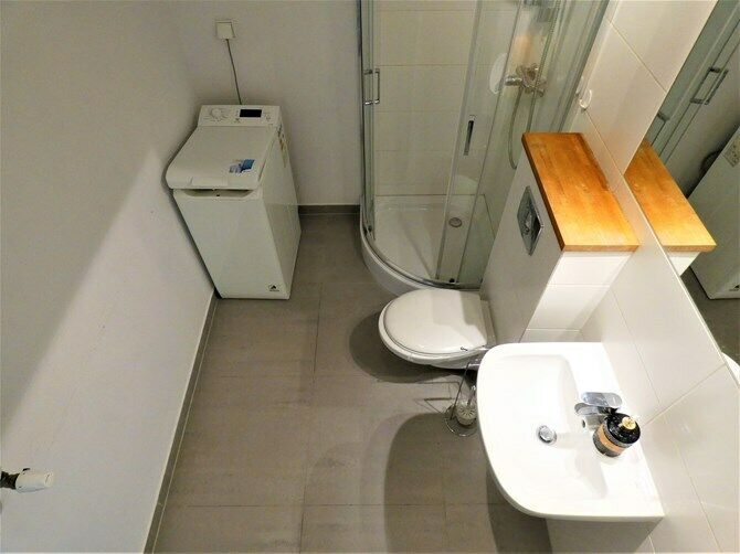 Łazienka razem z WC: lustro, kabina prysznicowa, pralka.