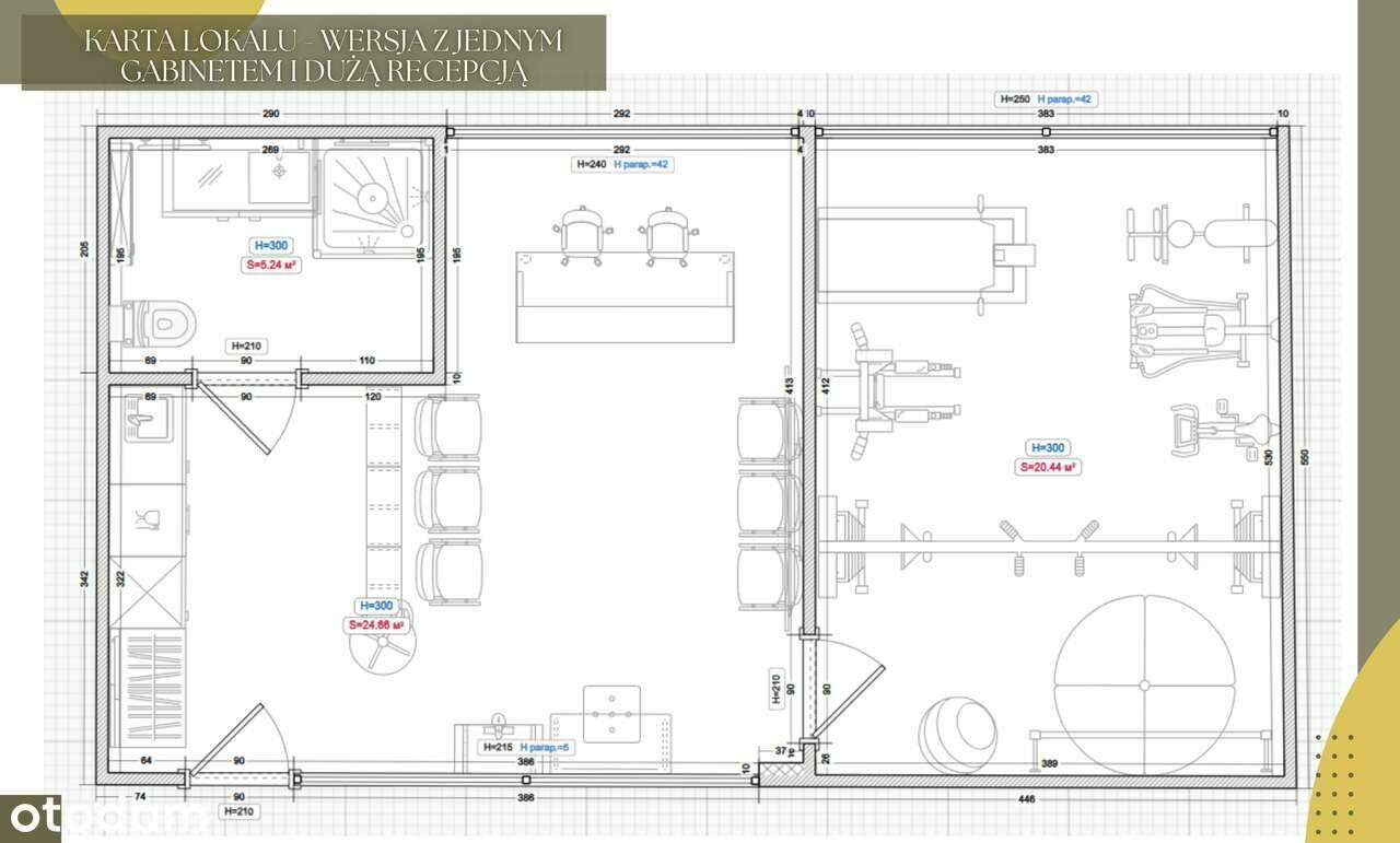 Na chwilę obecna lokal ma układ : przedpokój z aneksem kuchennym, łazienka toaletą i prysznicem i dwa gabinety, nadające się na gabinety medycyny estetycznej, rehabilitację, biuro itp. Istnieje możliwość łatwej przebudowy, tworząc dużą recepcję z poczekalnią, kosztem jednego gabinetu.
