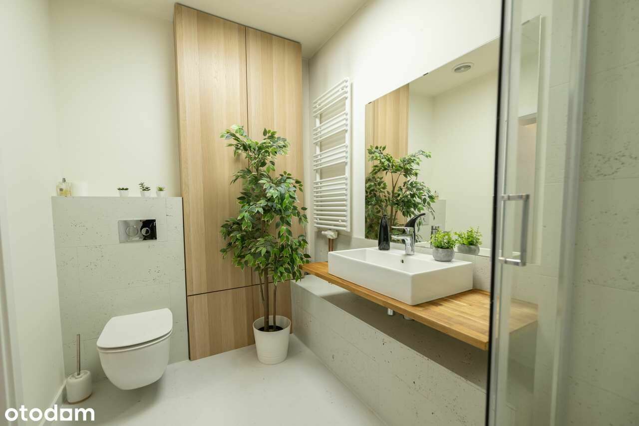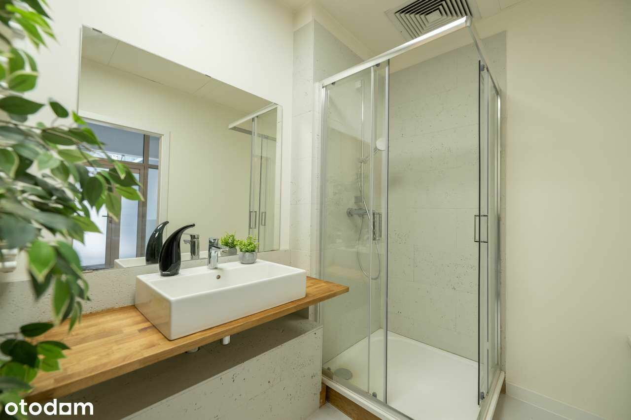 - Dobry stan techniczny – klimatyzacja centralna, monitoring, na podłogach panele drewniane i płytki, aneks kuchenny z lodówką i zmywarką, zabudowana szafa wnękowa.