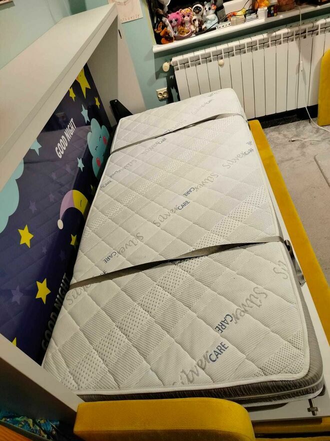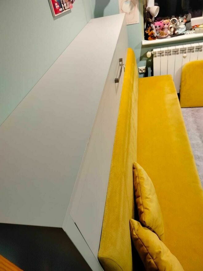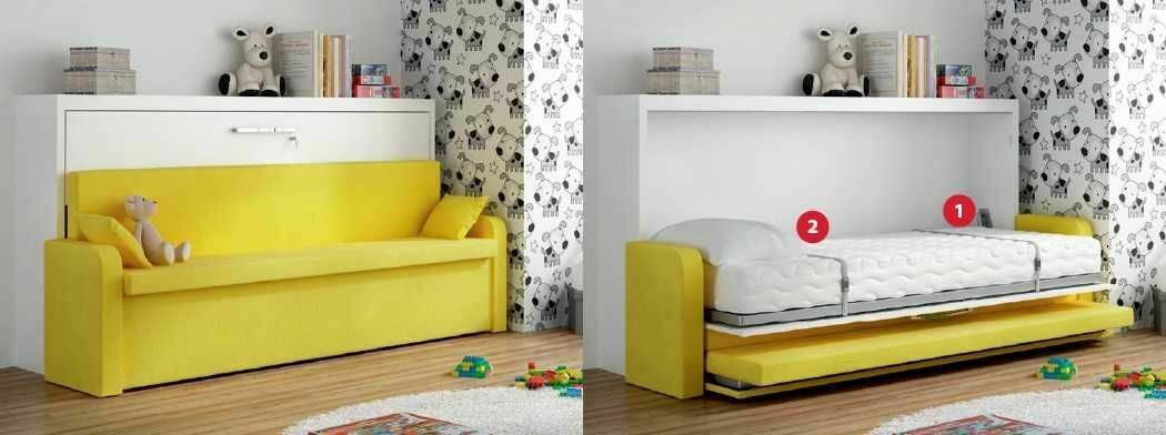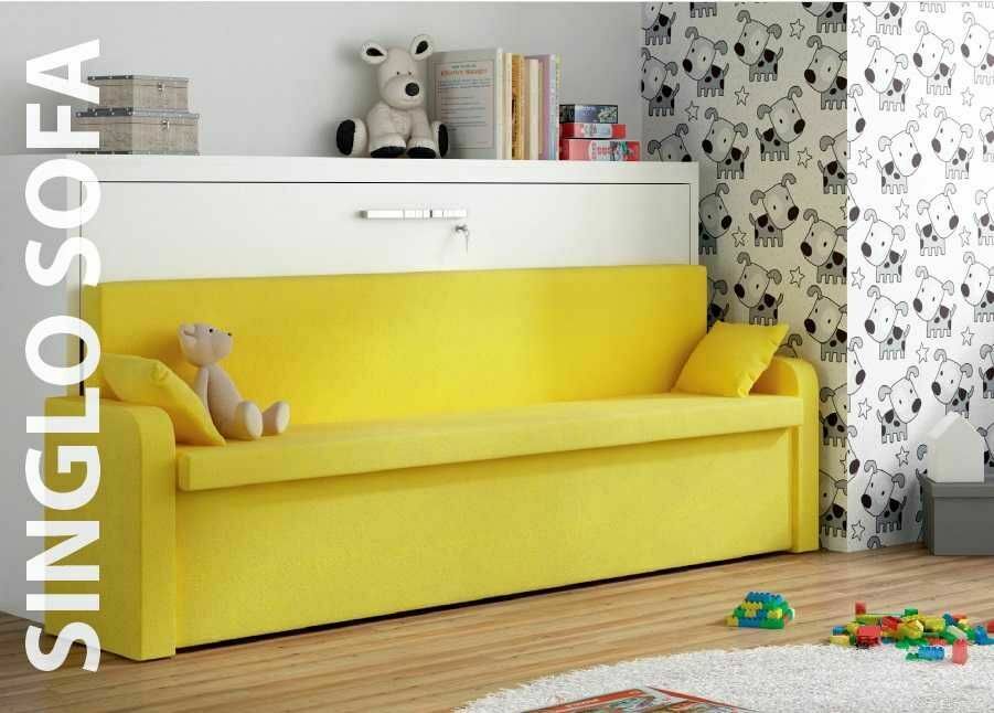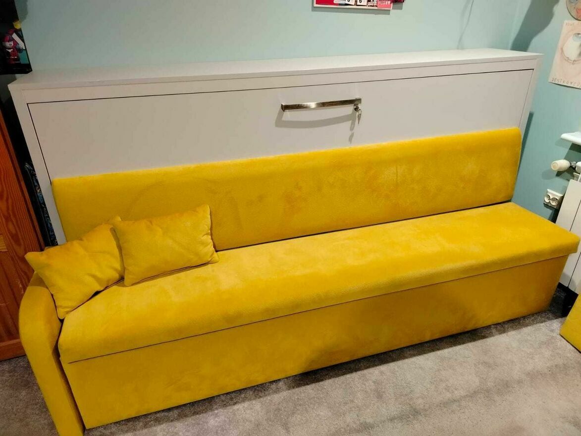 Praktyczne i funkcjonalne łóżko z wbudowaną szafą i sofą. Idealne rozwiązanie do małych pomieszczeń, gdzie każdy centymetr przestrzeni ma znaczenie. Łóżko o wymiarach 90x200 cm, tapicerowane w żółtym kolorze, nadające przytulny klimat wnętrzu.