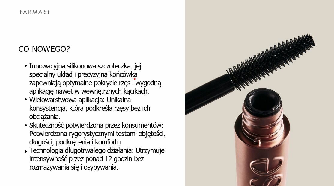 Wielowarstwowa aplikacja: Unikalna konsystencja, która podkreśla rzęsy bez ich obciążania. Skuteczność potwierdzona przez konsumentów: Potwierdzona rygorystycznymi testami objętości, długości, podkręcenia i komfortu. Technologia długotrwałego działania: Utrzymuje intensywność przez ponad 12 godzin bez rozmazywania się i osypywania.