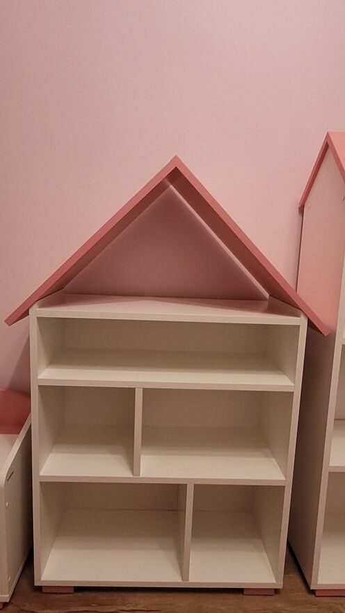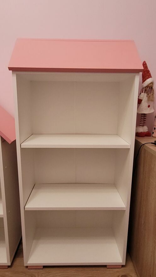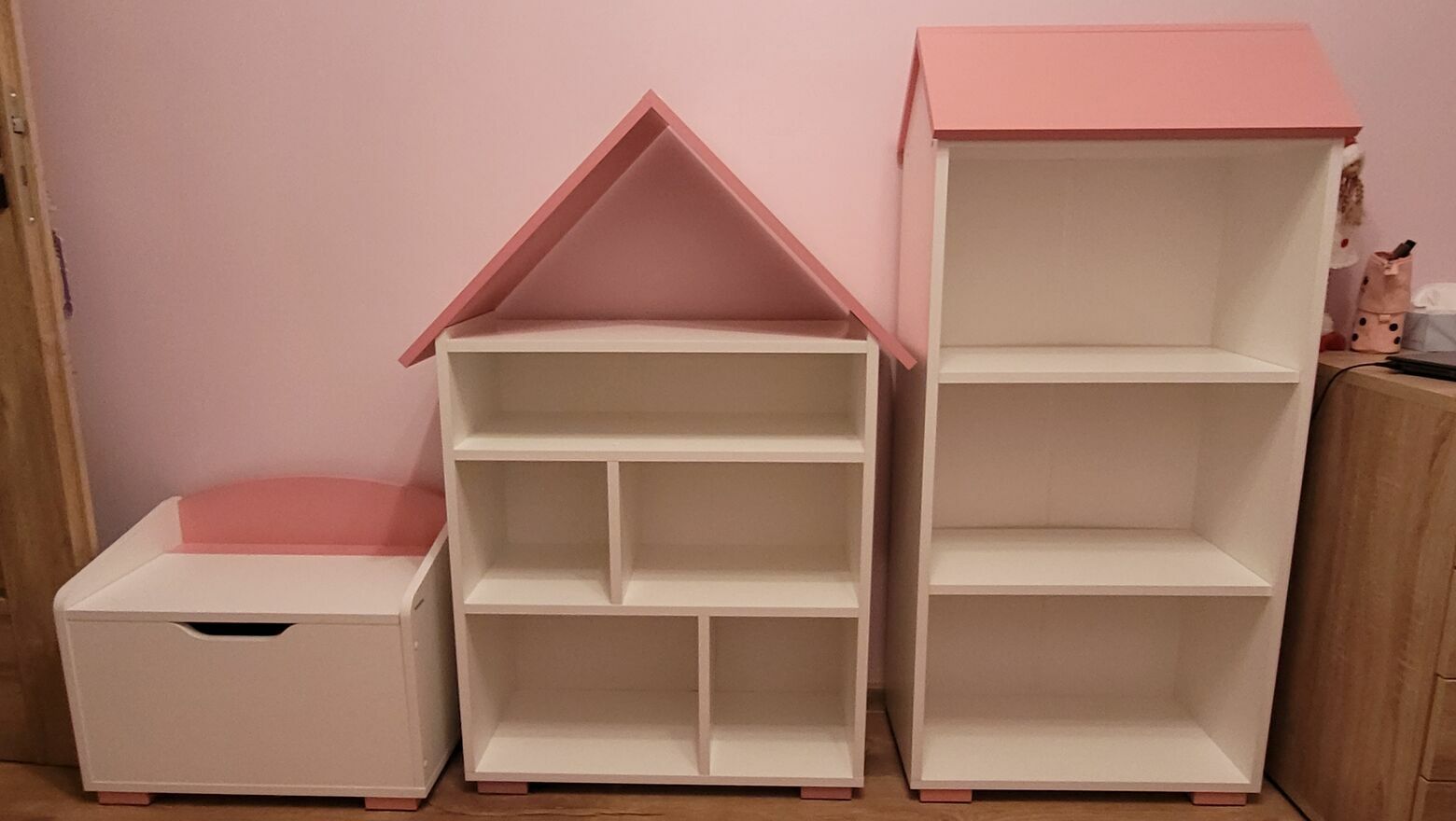 Zestaw mebli dla dziecka w kolorze białym i różowym. Składa się on z regału na książki, szafki na zabawki oraz skrzyni na przechowywanie. Meble są jak nowe bez uszkodzeń czy nawet zarysowań. Można też powiększyć zestaw o więcej elementów z tej kolekcji.Roger