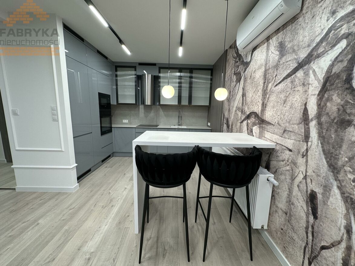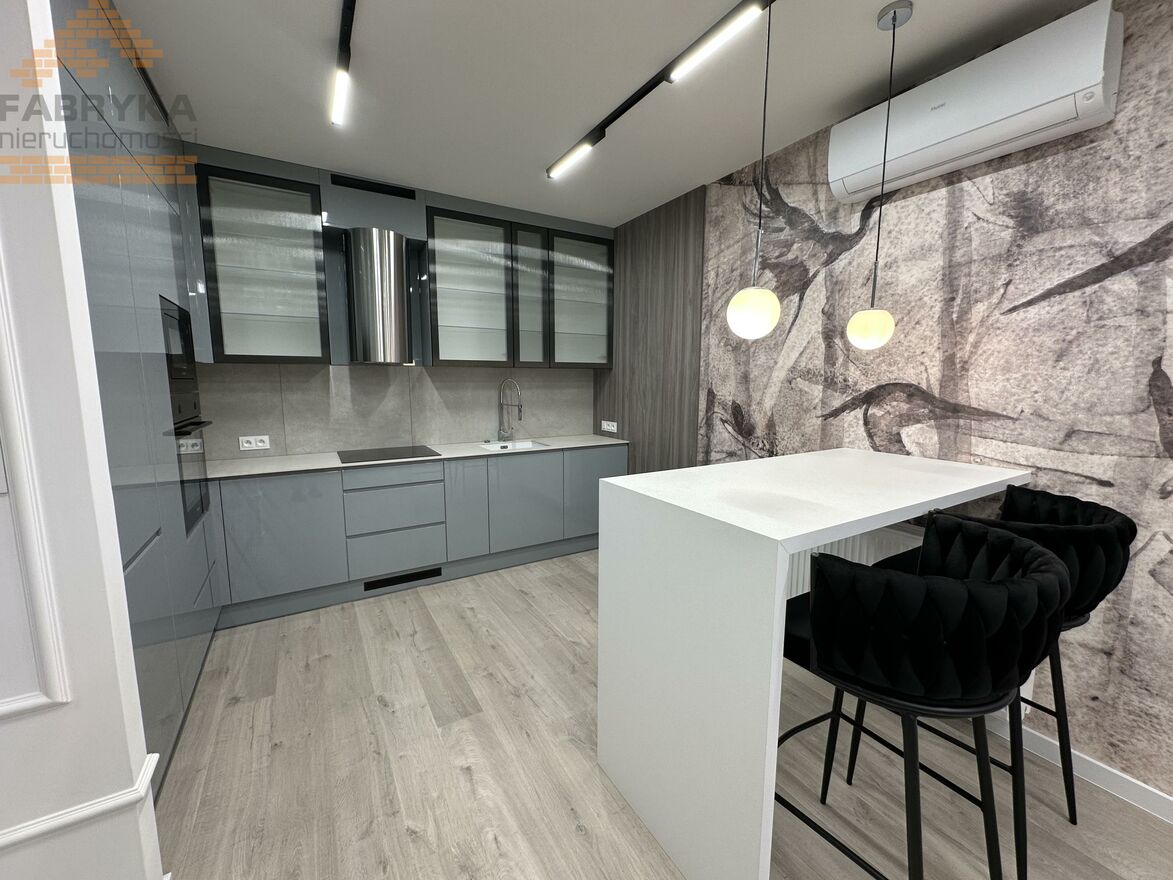 Salon z aneksem kuchennym(31,34m2)- Kuchnia wyposażona jest w lodówkę, płytę indukcyjna, zlew, okap, zmywarkę, piekarnik oraz duży blat roboczy. Salon w stół z krzesłami, kanapę z ławą oraz szafę