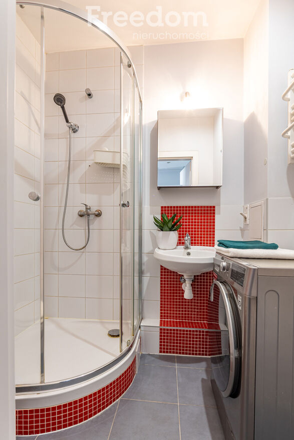 - Łazienka z prysznicem, utrzymana w przyjemnej aranżacji z