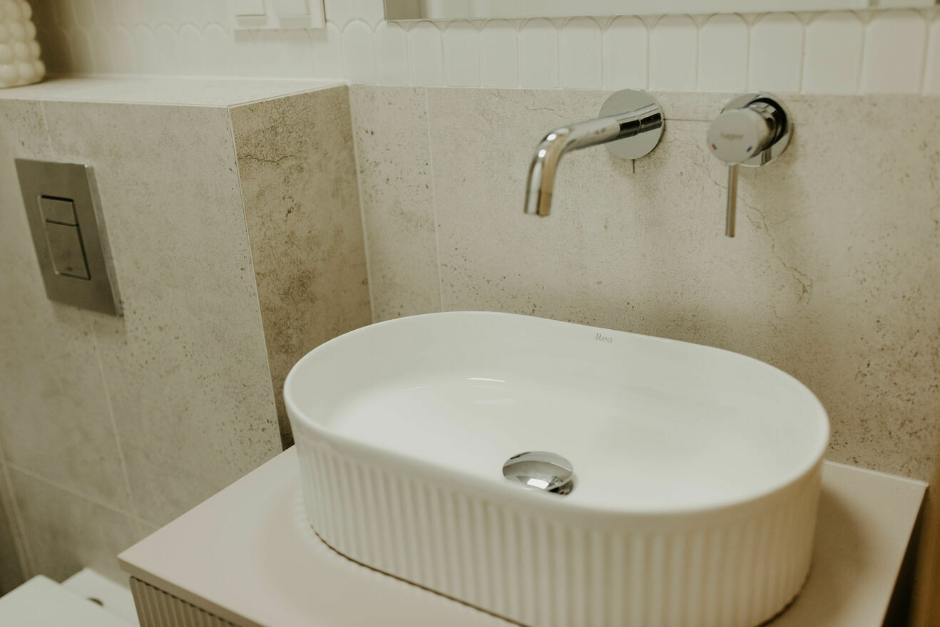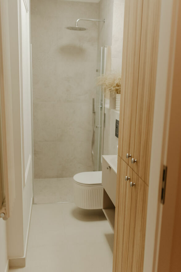 Łazienka – ogrzewanie podłogowe, nowoczesna zabudowa meblowa, kocioł dwufunkcyjny Junkers z zamkniętą komorą spalania, miejsce na pralkę