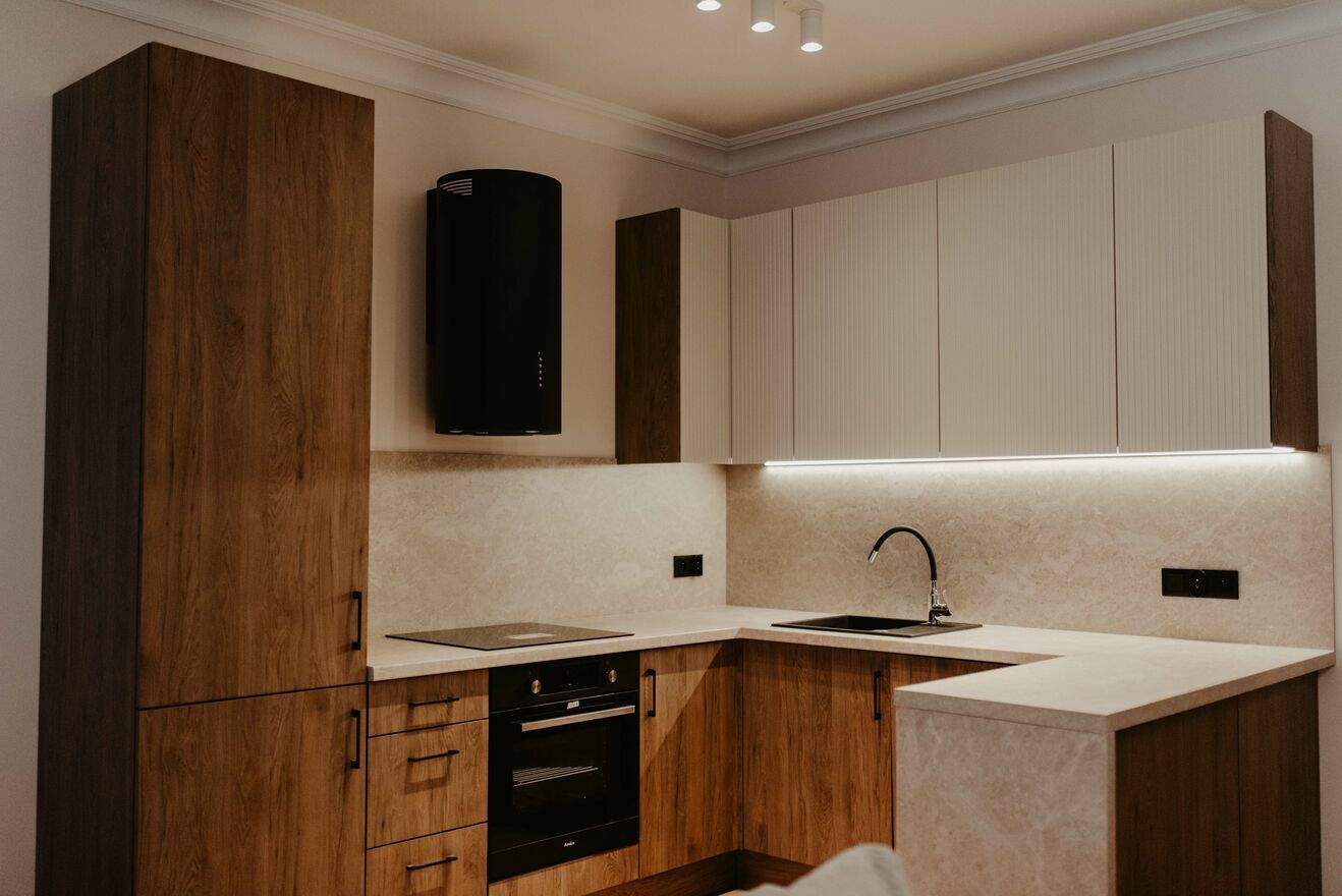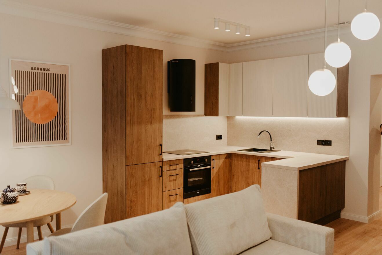 Salon z aneksem kuchennym – zabudowa meblowa wykonana na wymiar przez stolarza, sprzęt AGD w zabudowie: zmywarka, lodówka, płyta indukcyjna