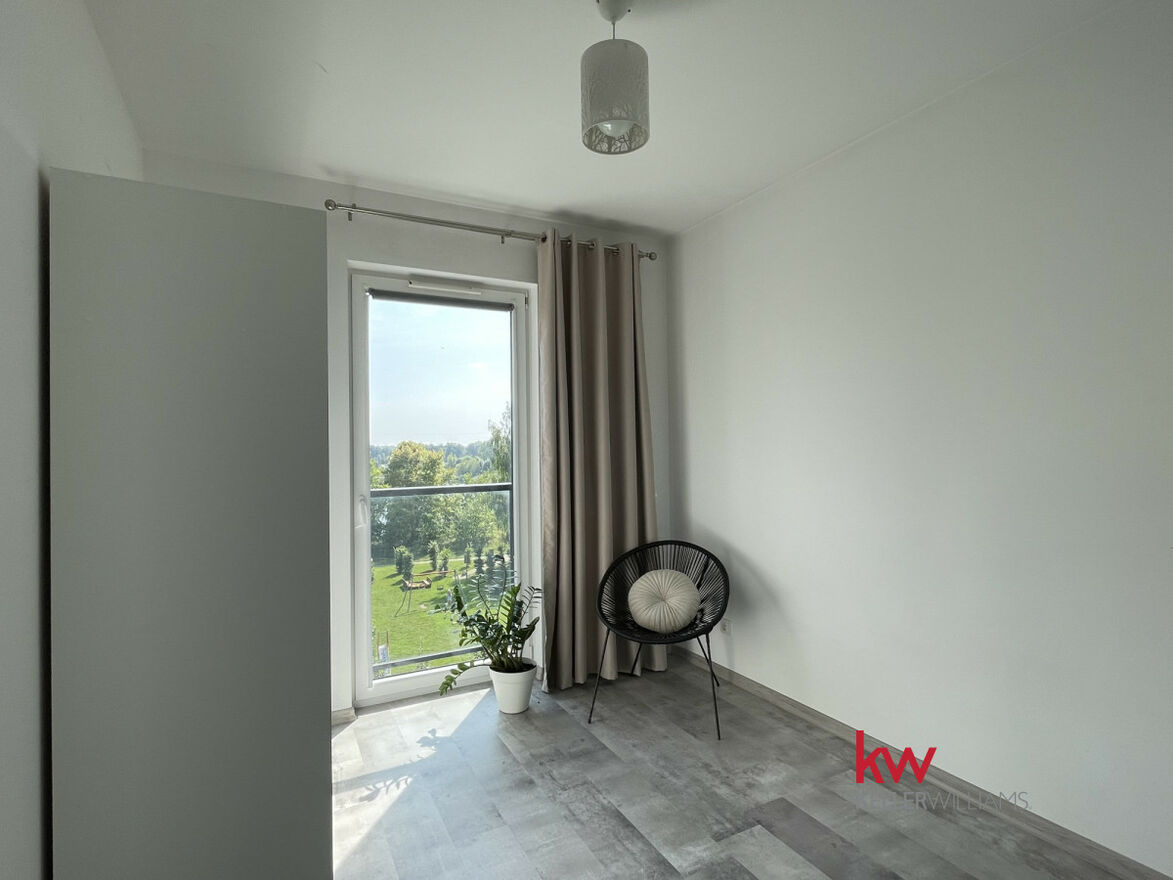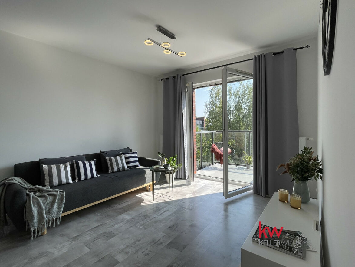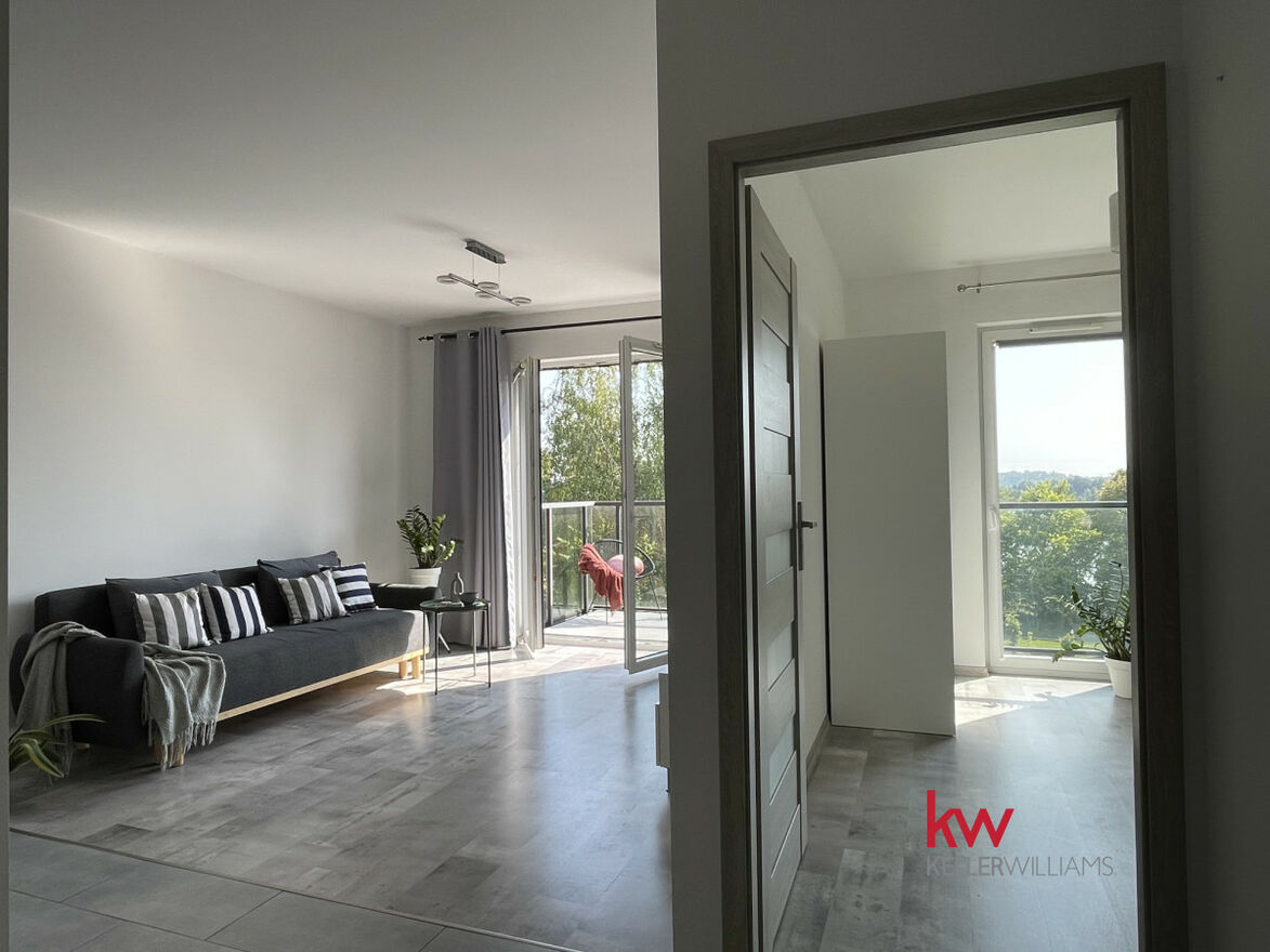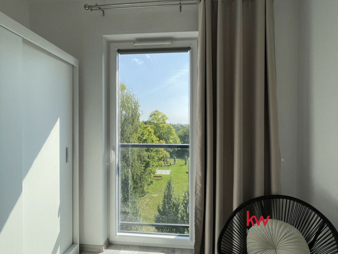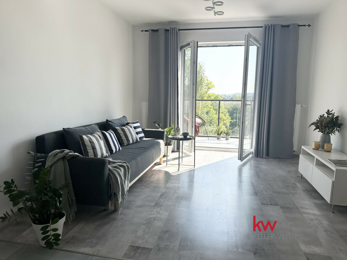 + salon z aneksem kuchennym i wyjściem na przeszklony balkon z widokiem na zieleń