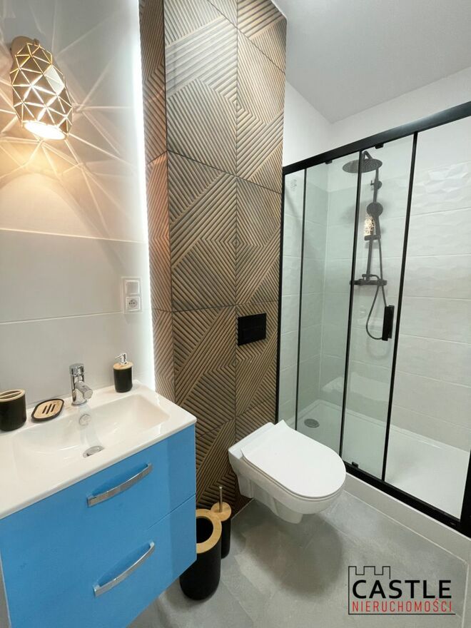 -łazienka z prysznicem, wykończona w nowoczesnym stylu