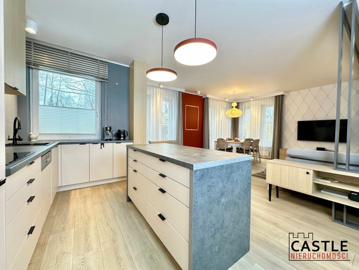-salon z aneksem kuchennym - przestronny z nowoczesną kuchnią w pełni wyposażoną w sprzęty AGD; centralnym punktem jest stylowa wyspa kuchenna, idealna do wspólnego gotowania i spotkań,