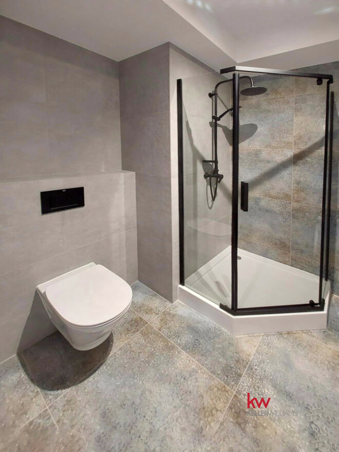 * Duża łazienka w eleganckich hiszpańskich kafelkach, wyposażona w kabinę prysznicową i nową pralkę.