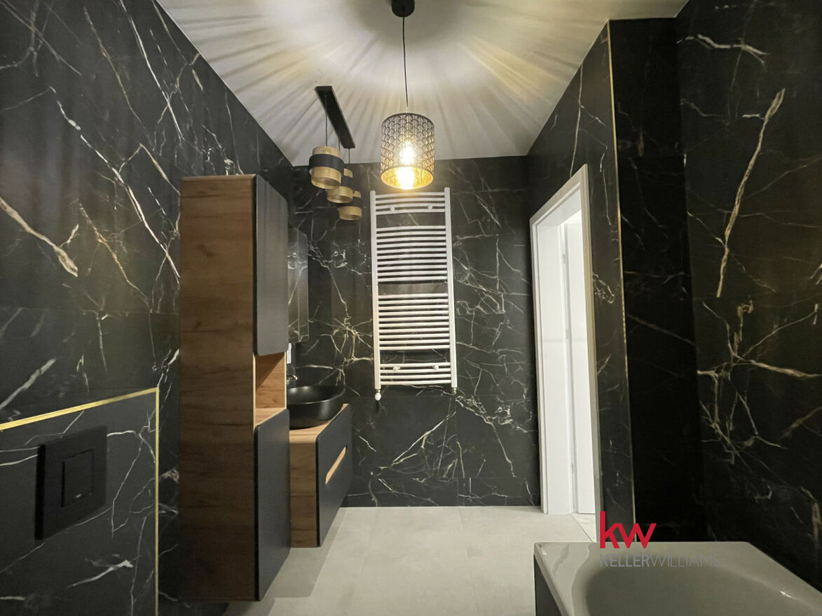 • Łazienka w eleganckim stylu czarnego marmuru, z wanną, pralką, lustrem i zabudową meblową