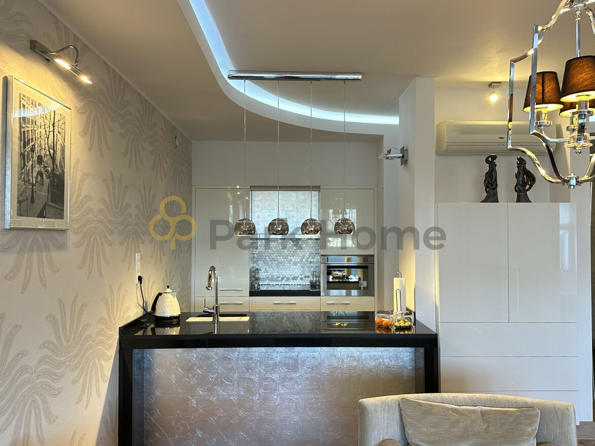 Centralnym punktem części dziennej jest imponująca wyspa kuchenna wykonana z czarnego granitu, polerowanego na wysoki połysk, który nadaje przestrzeni elegancki i nowoczesny charakter. Ścianki dekoracyjne wykończono płatkami srebra aplikowanymi techniką decoupage, co podkreśla unikalny styl wnętrza.