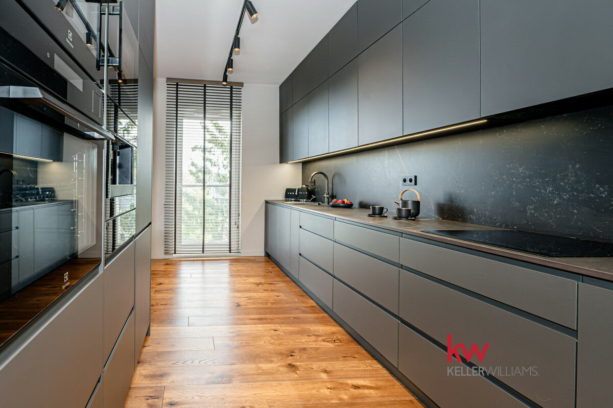 ● Wysoka jakość użytych materiałów, między innymi : podłoga z litego dębu, matowe blaty z kamienia sprowadzane z Hiszpanii, luksusowa armatura marki Tres, dwie lodówki Liebherr, system filtracji wody grohe.