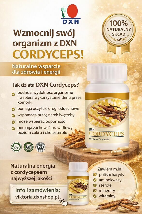 • DXN Cordyceps – wsparcie energii i odporności, poprawa wydolność płuc ( więcej tlenu)
