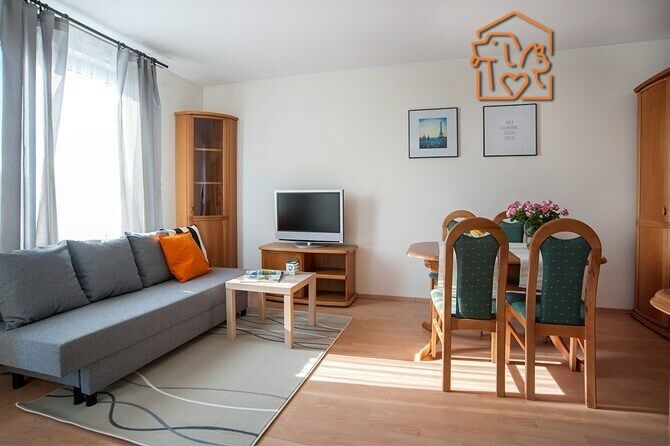 Salon: rozkładana kanapa, stół z 4 krzesłami, telewizor, szafki.