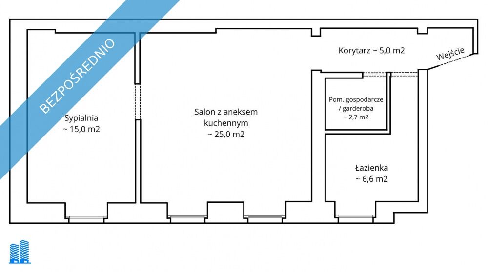 - 2 pokoje (salon z aneksem ~ 25,0 m2, sypialnia ~ 15,0 m2),