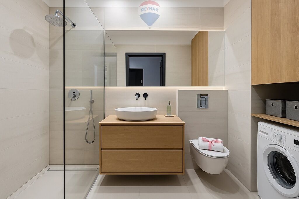 -łazienka z prysznicem i pralką,