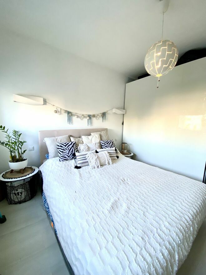 Po prawej stronie znajdują się dwoje drzwi. Pierwsze prowadzą do łazienki, w której znajduje się prysznic, szafka umywalkowa, szafka typu komin, pralka. Drugie drzwi prowadzą do sypialni, wyposażonej w pojemną szafę w jasnym kolorze oraz łóżko.