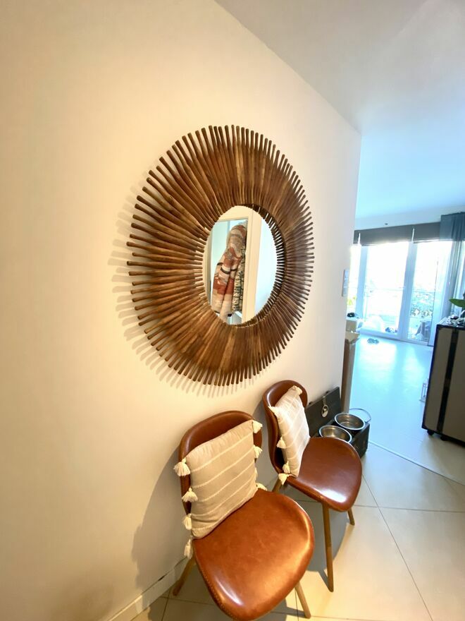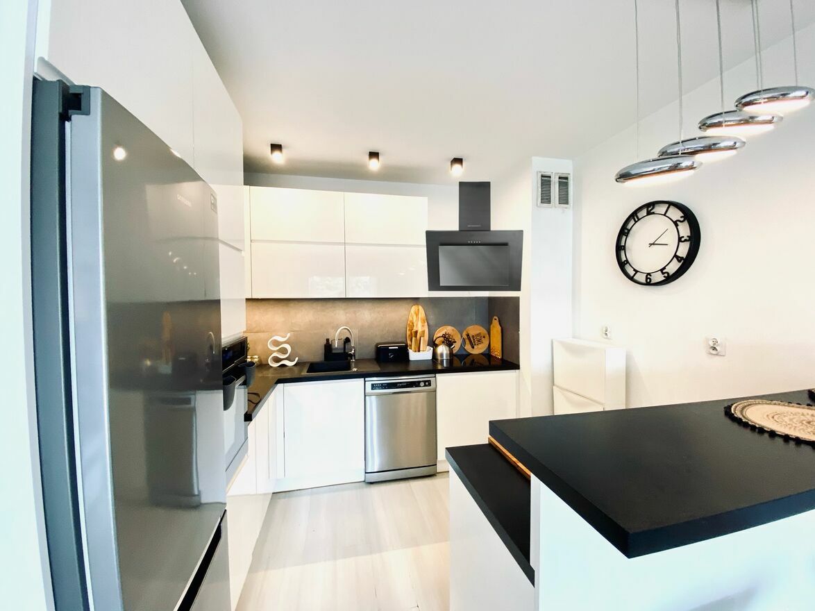 W korytarzu znajduję się przestronne wejście do salonu, a po jego lewej stronie – przejście do salonu z aneksem kuchennym.Kuchnia, ukryta po lewej stronie, została wykonana na wymiar przez stolarza i wyposażona w sprzęt AGD (zmywarka, piekarnik, płyta indukcyjna, miejsce na zabudowaną mikrofalówkę). Oddziela ją od salonu funkcjonalny wyspa typu barowego z hokerami. W części salonowej znajduje się miejsce na stół dla sześciu osób, kanapa oraz szafka RTV. Mamy tu również wyjście na duży balkon typu loggia.