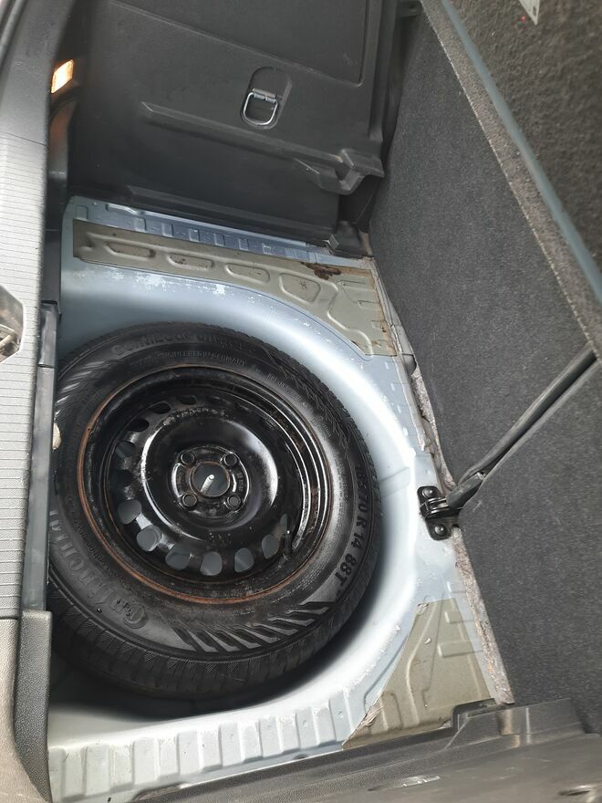 Pełnowymiarowa zapasówka, lewarek, kamizelka, klucz do kół