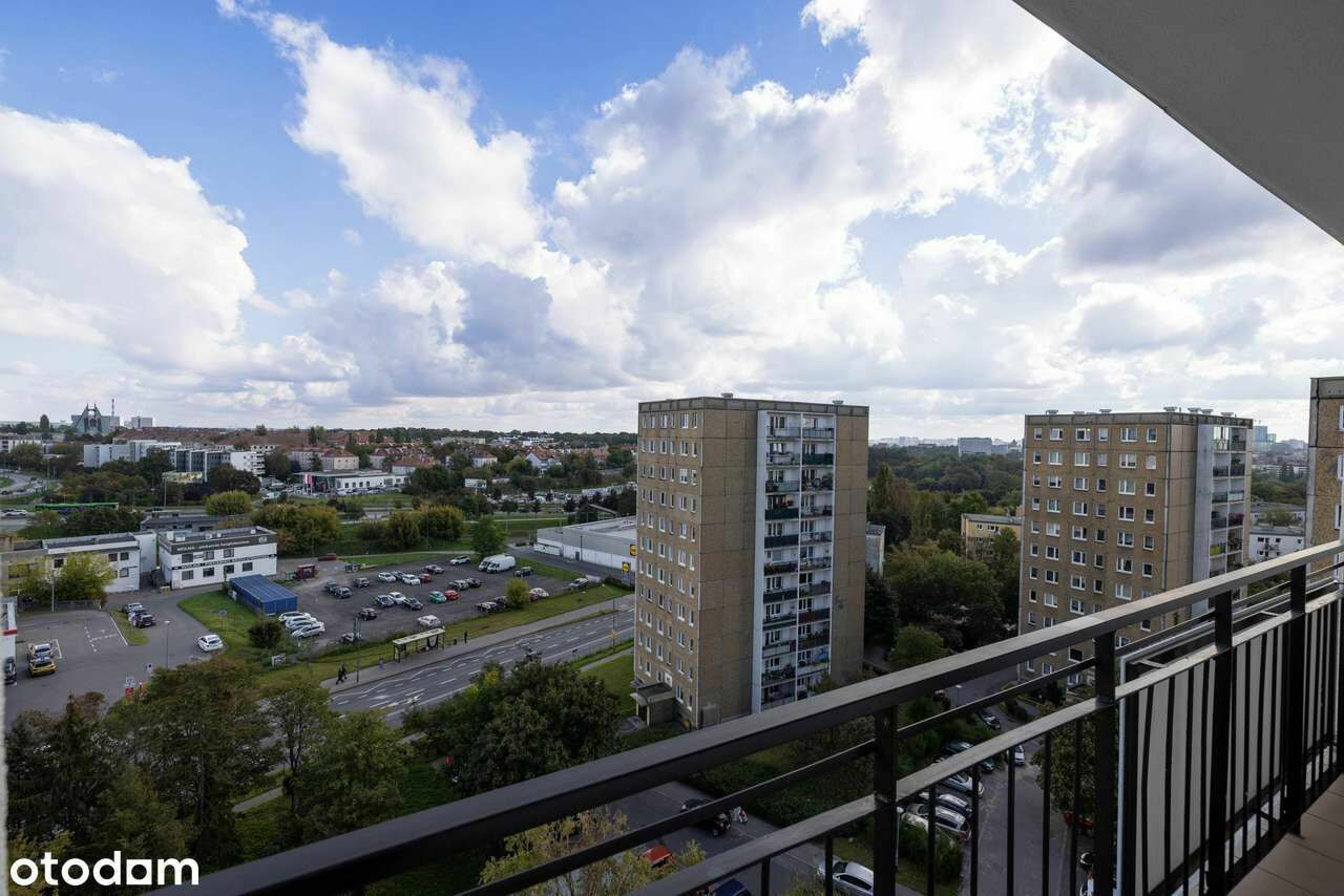 Mieszkanie znajduje się na 9. piętrze w 10-piętrowym budynku otoczonym zielenią. Pomimo niewielkiej odległości od centrum, okolica jest wyjątkowo spokojna, rodzinna i przyjazna. Pod blokiem znajduje się plac zabaw, a w pobliżu liczne tereny spacerowe.