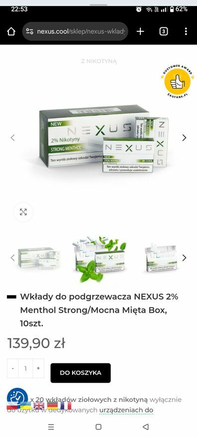 Witam serdecznieMam do sprzedania nowego - jeszcze nie używanego ( tylko wyjętego z pudełka dla sprawdzenia ) e-papierosa NEXUS w kolorze zielonym oraz 2 kartony wkładów o smaku mentolowym i naturalnym / papierosowym 2% :