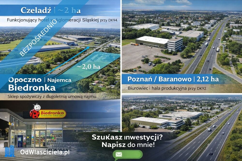 Na sprzedaż trzy atrakcyjne nieruchomości komercyjne w różnych lokalizacjach w Polsce – z potencjałem inwestycyjnym oraz stabilnym dochodem.1. Czeladź – hotel z gruntem inwestycyjnym (~2 ha) Funkcjonujący hotel z restauracją w Aglomeracji Śląskiej, przy DK94 z szybkim dojazdem do Katowic i lotniska. Nieruchomość z potencjałem rozbudowy (np. SPA, konferencje, funkcja mixed-use).