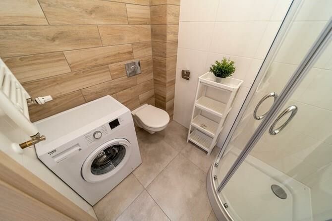 Łazienka razem z WC: lustro z półką, kabina prysznicowa, pralka,