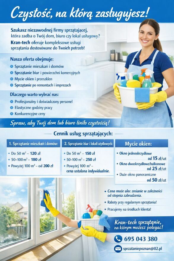 Czystość, na którą zasługujesz!Szukasz niezawodnej firmy sprzątającej, która zadba o Twój dom, biuro czy lokal usługowy? Kran-tech oferuje kompleksowe usługi sprzątania dostosowane do Twoich potrzeb!