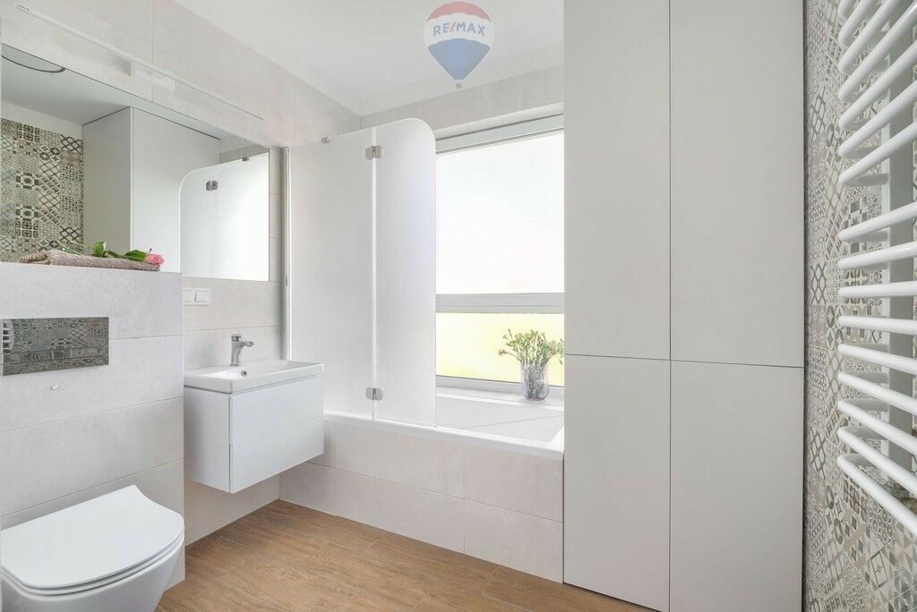 - W łazience znajduje się wanna, WC oraz pralka BOSCH ukryta w