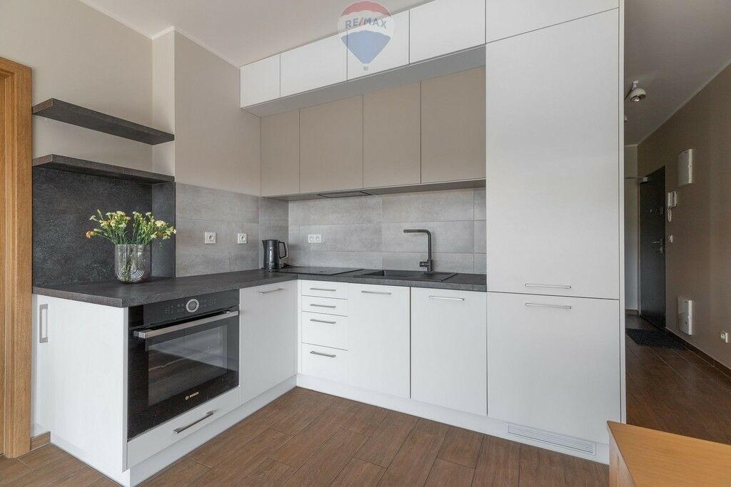 - Kuchnia została zaopatrzona w meble w zabudowie oraz wysokiej klasy