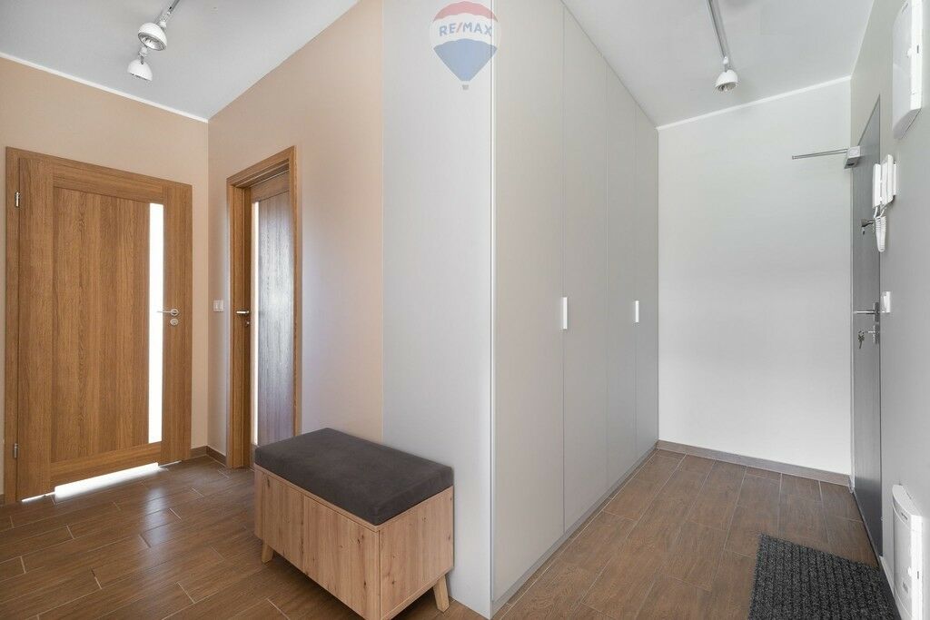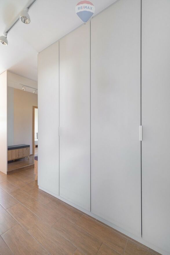 - Korytarz został wyposażony w dwie duże szafy w zabudowie,