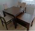 Solidny, ciemnobrązowy stół z czterema krzesłami. Stół ma rozkładaną powierzchnię, złożony o wymiarach 80x80. po ...