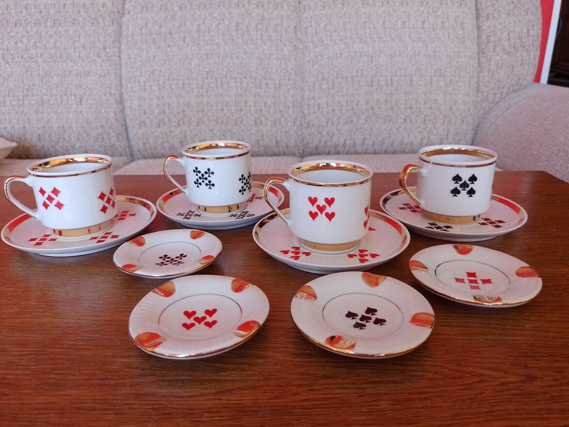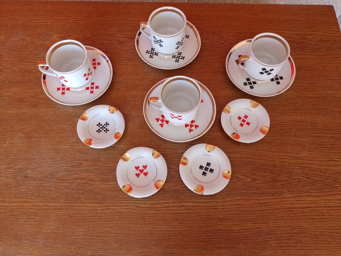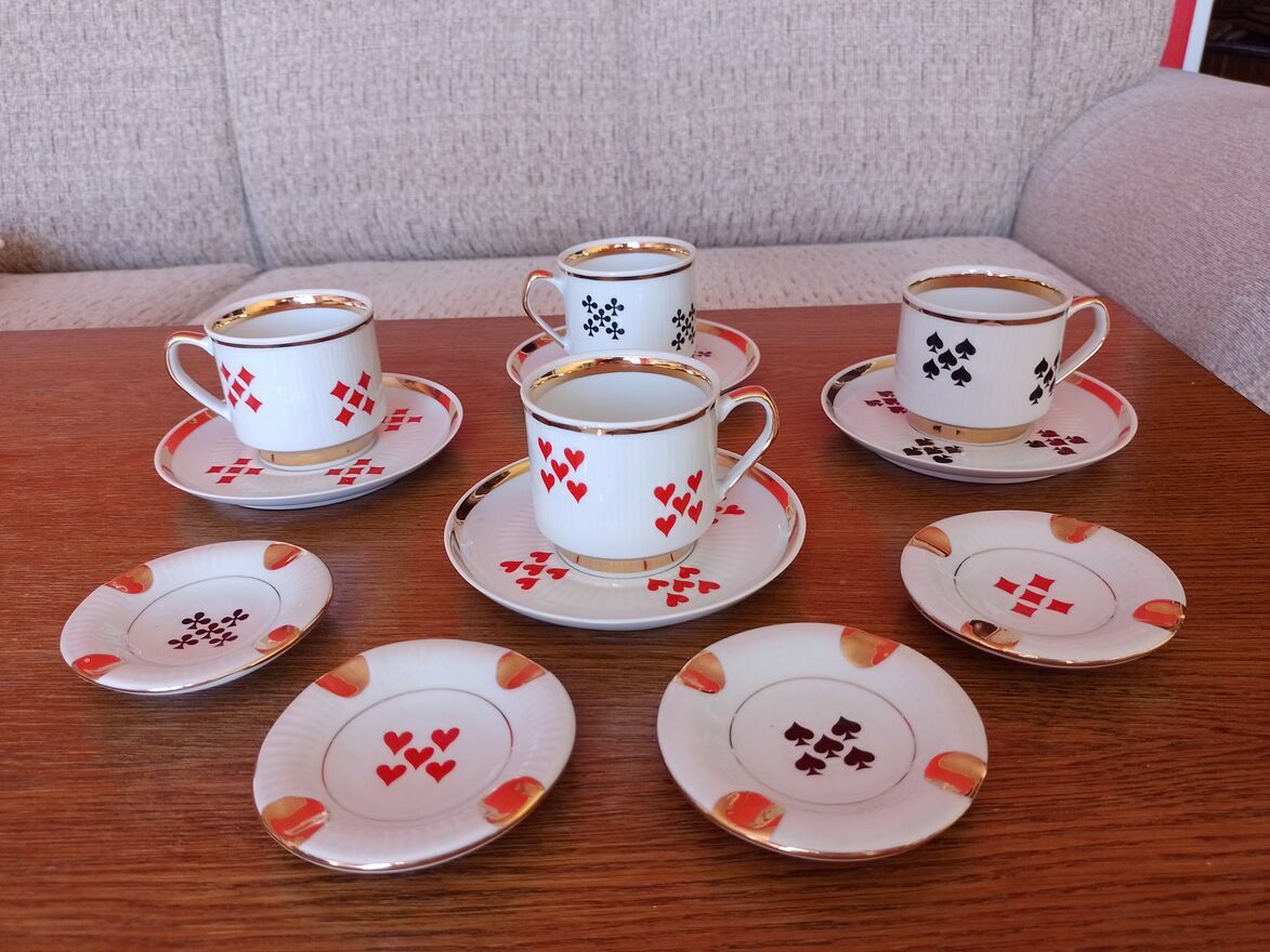 Serwis porcelanowy z lat 70-tych ROMAN CHODZIEŻ.W skład wchodzą 4 filiżanki, 4 talerzyki i 4 popielniczki z wzorami karcianymi.
