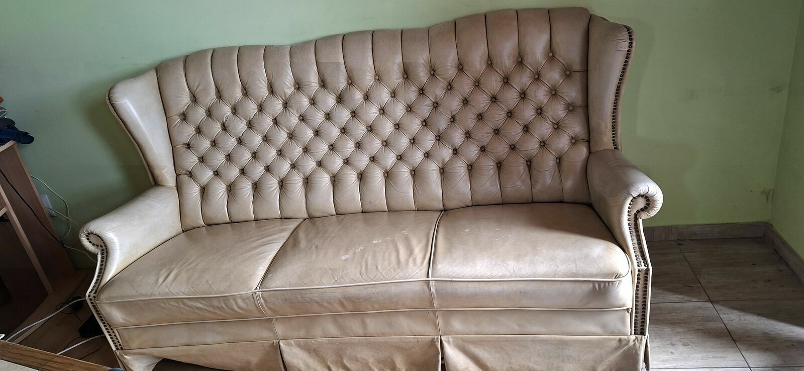 Witam .Mam do sprzedania Sofę skórzaną model Chesterfield charakteryzujący się pikowanym oparciem .Tapicerka skórzana w jasnym beżowym kolorze ,Pikowane oparcie z guzikami oraz ozdobne ćwieki . długość190 cm ,Wys 98 ,szer powierzchni siedzenia .Sofa nie rozkładana.. Oraz mniejsza szer 35 długość 135 wys 100.W kwocie 2300.Majka