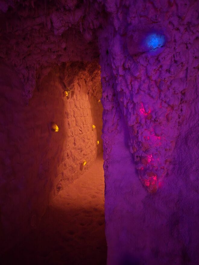 Ściany groty wyłożone są białymi blokami solnymi pochodzącymi z Morza Martwego. Podłogę pokrywają solne kryształki, z sufitu zwisają sople uformowane ze specjalnej masy z dodatkiem soli. Panuje tu specyficzny mikroklimat, charakteryzujący się odpowiednią wilgotnością, temperaturą oraz właściwą cyrkulacją powietrza. System podgrzewania i przedmuchiwania słonych murów sprawia, że sól paruje, jonizując ujemnie powietrze oraz nasycając je cennymi dla zdrowia biopierwiastkami.