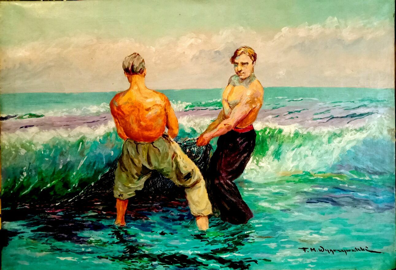 Obraz na płótnie o wymiarach 45x65 cm, bez ramy. Płótno wygląda na stare. W prawym dolnym rogu sygnatura: "F.M. Wygrzywalski".Za oryginalność autorską trudno zaręczyć, jest to raczej kopia i do tej kategorii go zaliczam (za ostrożną opinią osoby, która zna te tematy).