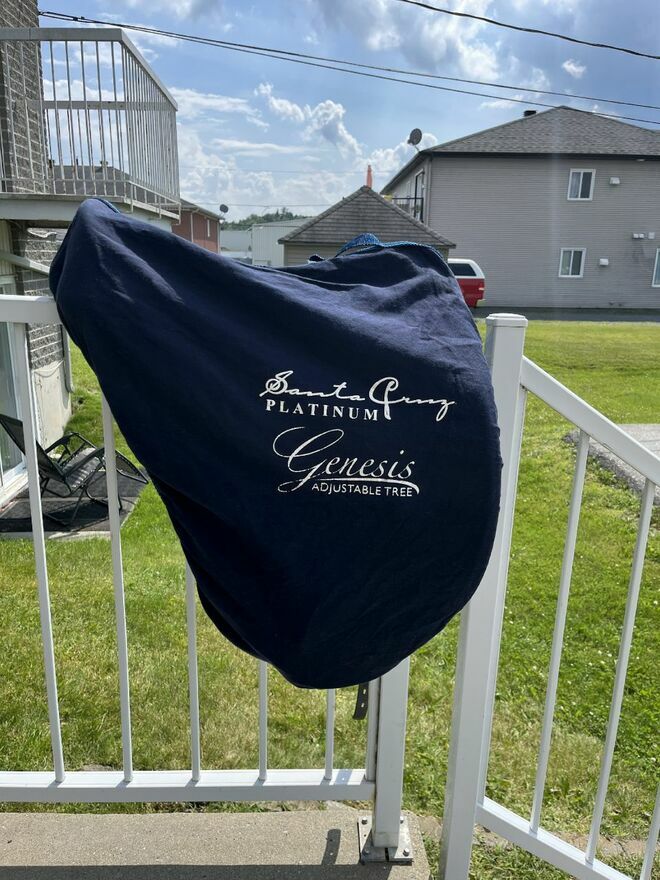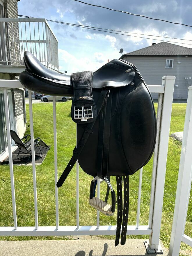 Viens avec l'ensemble des outils pour ajuster l'arçon, étriers de sécurité, étrivières stübben en cuir, sangle 24 po en synthétique, couvre selle d'origine, support à selle mural.