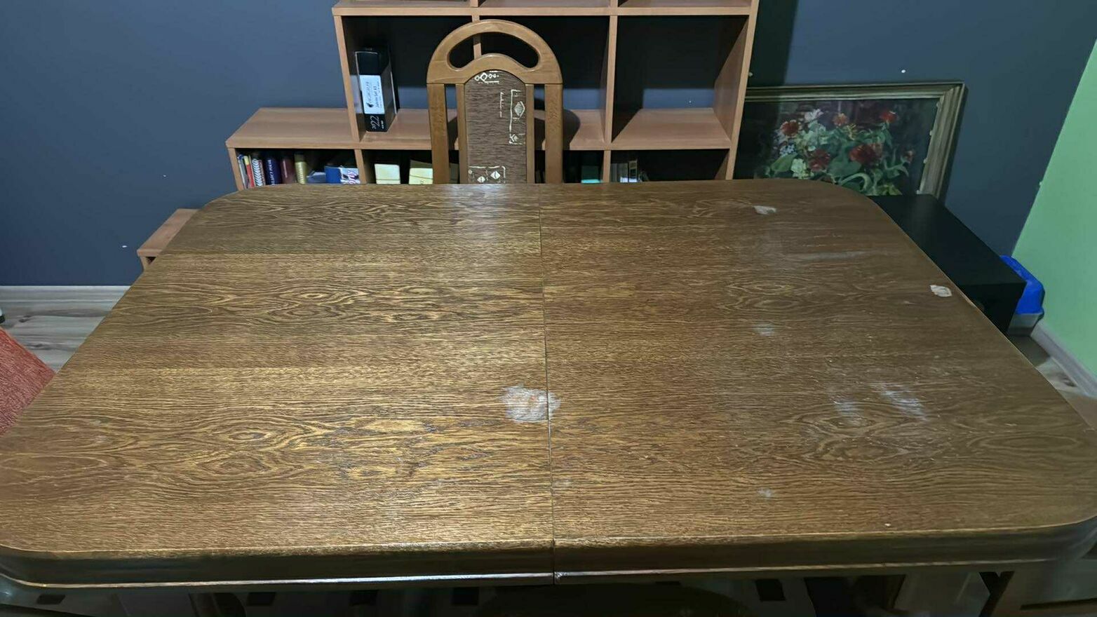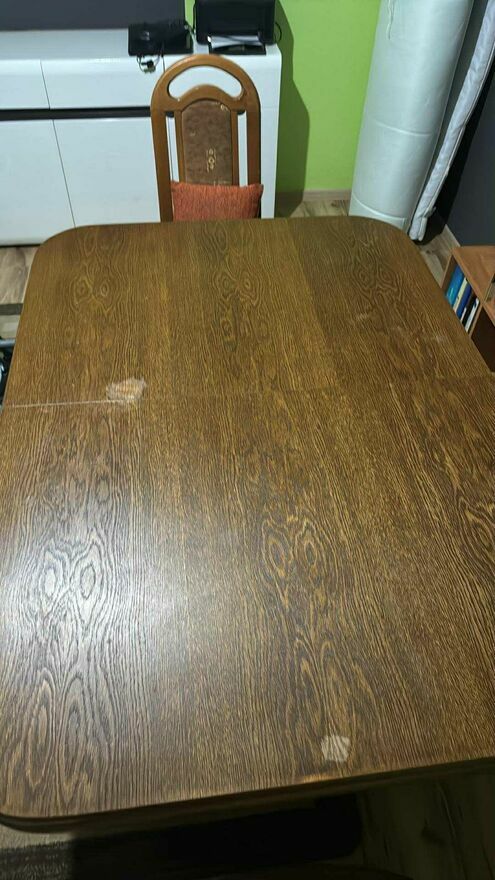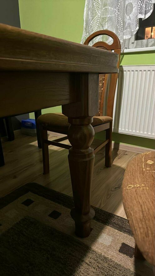 Sprzedam Stół rozkładany drewniany ,solidny , porządnie wykonany na zamówienie. Wymiary 100cm x 140cm z możliwością rozłożenia do 340cm długości. Nogi toczone w drewnie. Delikatnie ślady po zmywaczu na blacie. W komplecie 4 krzesła tapicerowane.Polecam , cena do negocjacji. Możliwość transportu w obrębie miasta Poznań.